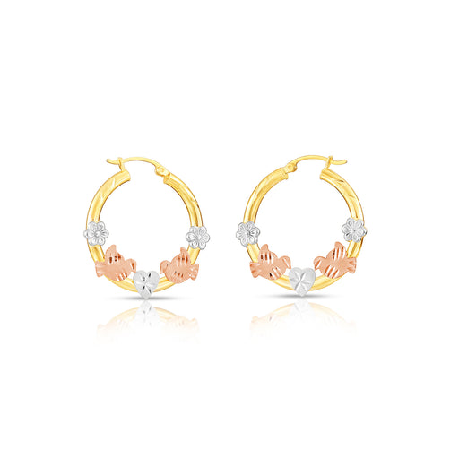 14K Gold Tri-Color Hoop with Birds and Diamond Cut Design, Flat Bar